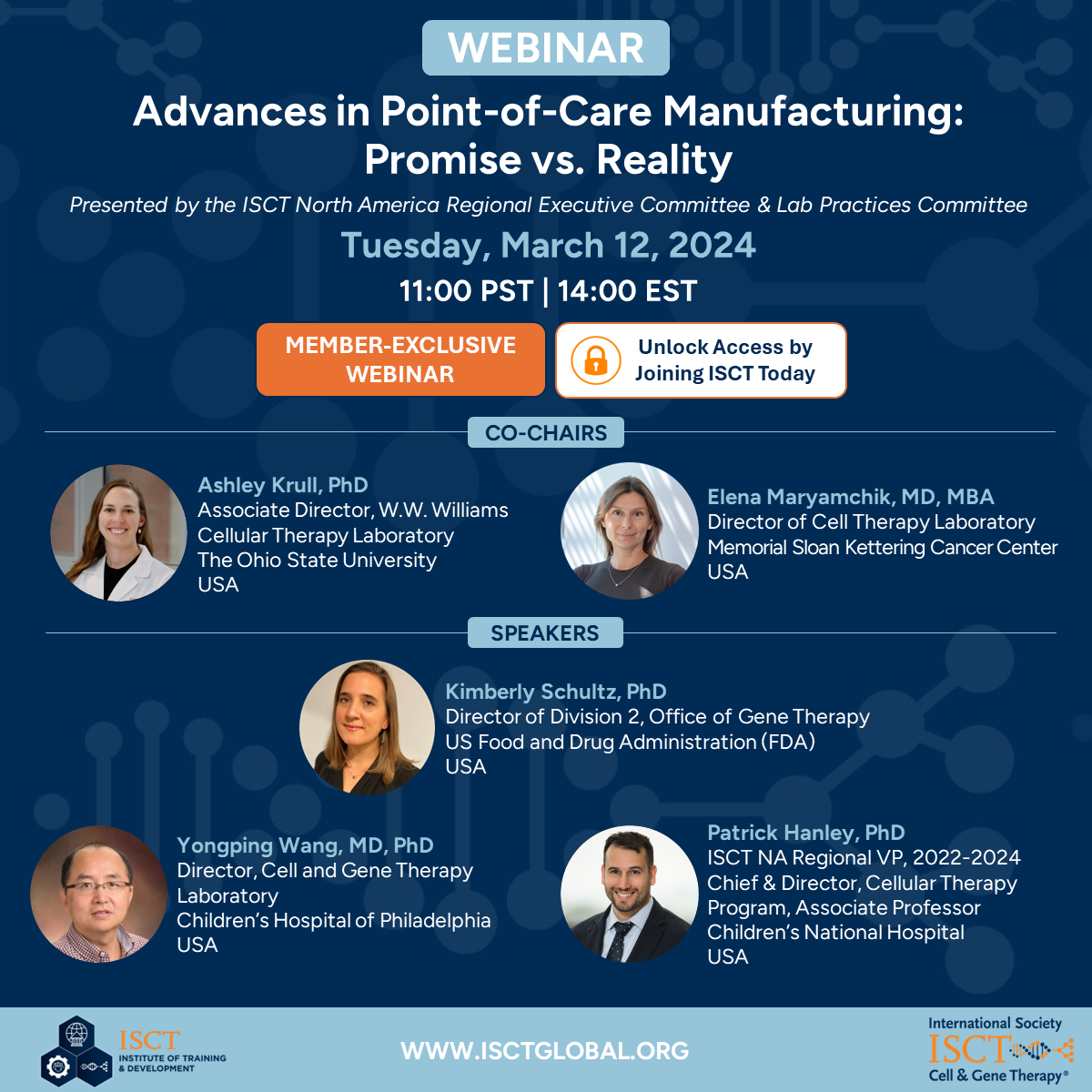 Real-life experts will speak about their experience of building a point-of-care manufacturing program at a clinical laboratory. They will discuss the challenges, the potential solutions, and the regulatory aspects of in-house manufacturing, and provide perspective from the different vantage points of their respective roles.