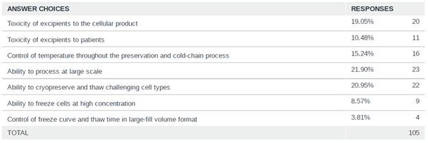 Scaling the cryopreservation was identified as a major hurdle for the industry to further support the advancement of cell and gene therapies, with the majority of respondents (22%) identifying “Ability to process at a large scale” as the biggest hurdle to overcome for cryopreservation. As more therapies move closer to commercialization, scaling techniques and technologies will be required to ensure that therapies are manufactured and cryopreserved in a manner that is efficient while maintaining the critical quality attributes of the therapy.